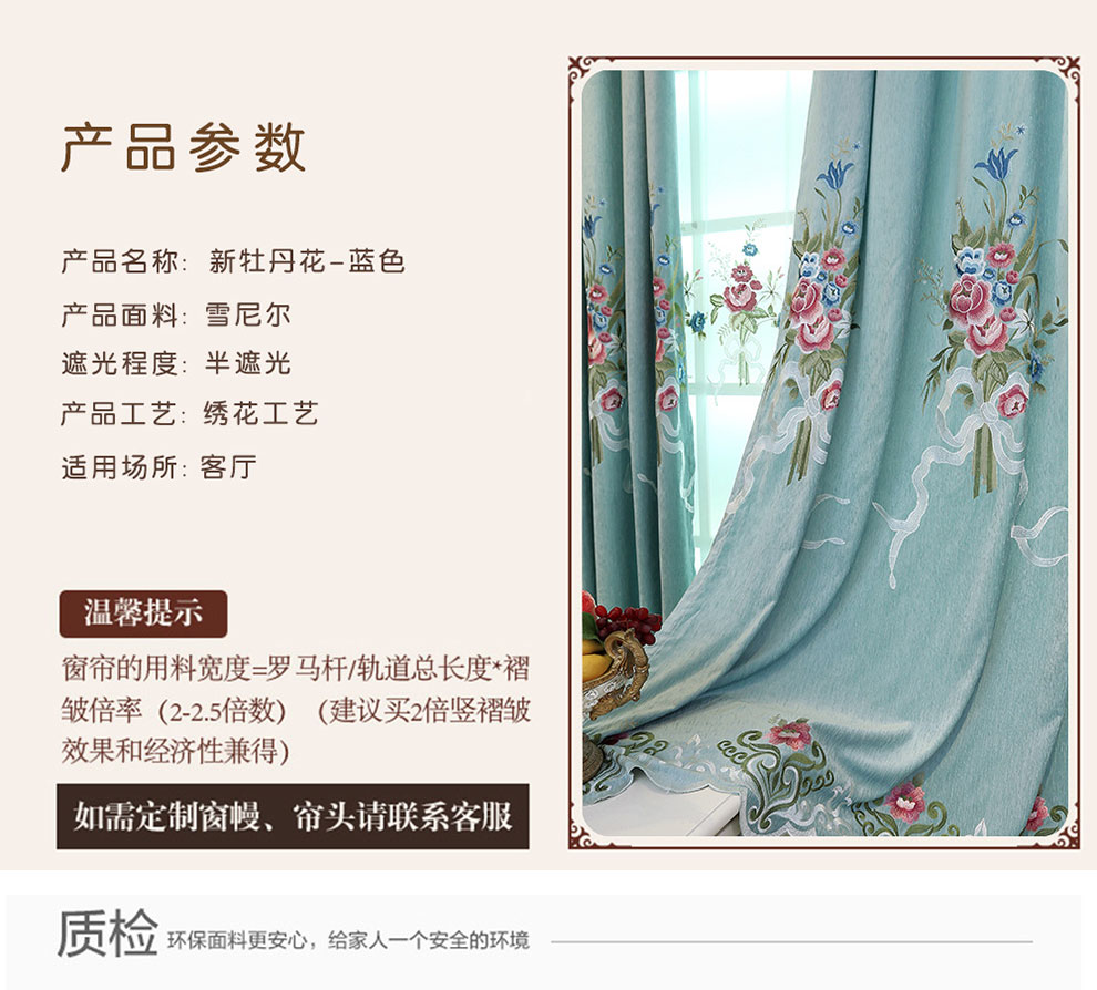 席韻の家紡の新型の客間の寝室のベランダのシニールのカーテンの刺繍の窓のカーテンはカスタマイズすることができます青緑色の布の注文して作らせます。幅1メートル*高さ2.7メートルの単価(4本の爪のフック)は高さを変えることができます。
