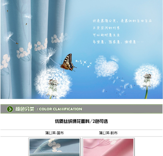 韓式の田園の絹の絨の麻のタオルは蒲公英の刺繍の遮光のカーテンの布地を刺繍して、蒲公英を注文して作らせます。青い布地の高さは2.7 mで、幅1メートルの布地の袋の4本の鉤を改善できます。